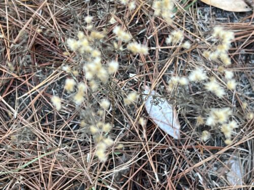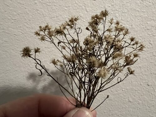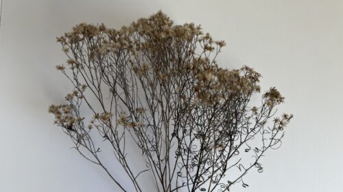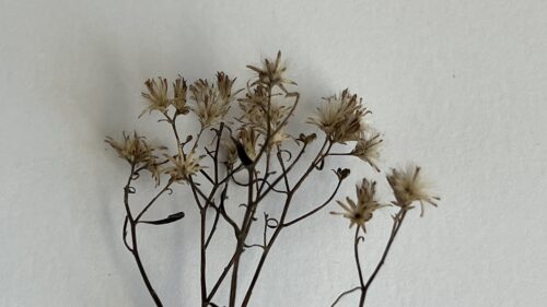 The plants were the remains of last year’s asters. The stems were thin and brittle and snapped easily. The flower heads sat at the very tips of the branches, gathered in small clumps, while lower down the leaves had dried into tight curls. The heads themselves were soft and puffy, like small clouds held on branching sticks. These dried aster stems became the artifact of the day.