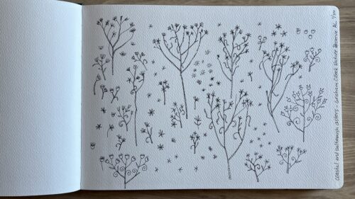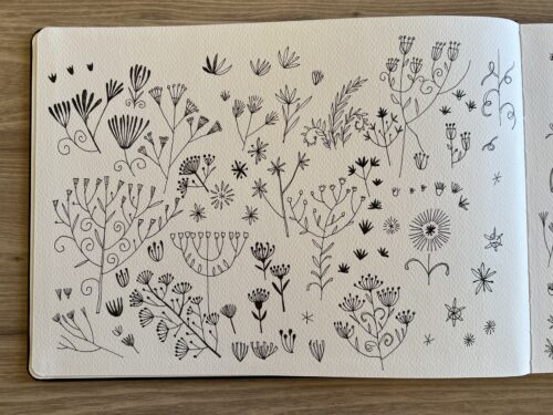 I explored simplified starbursts, radiating lines, cup-like forms, and loose spirals derived from the dried leaves. As the page filled, some drawings stayed close to the original structure, while others drifted into more generic floral territory. At this stage, the work was intentionally exploratory—focused on discovering a visual language rather than locking in solutions.
